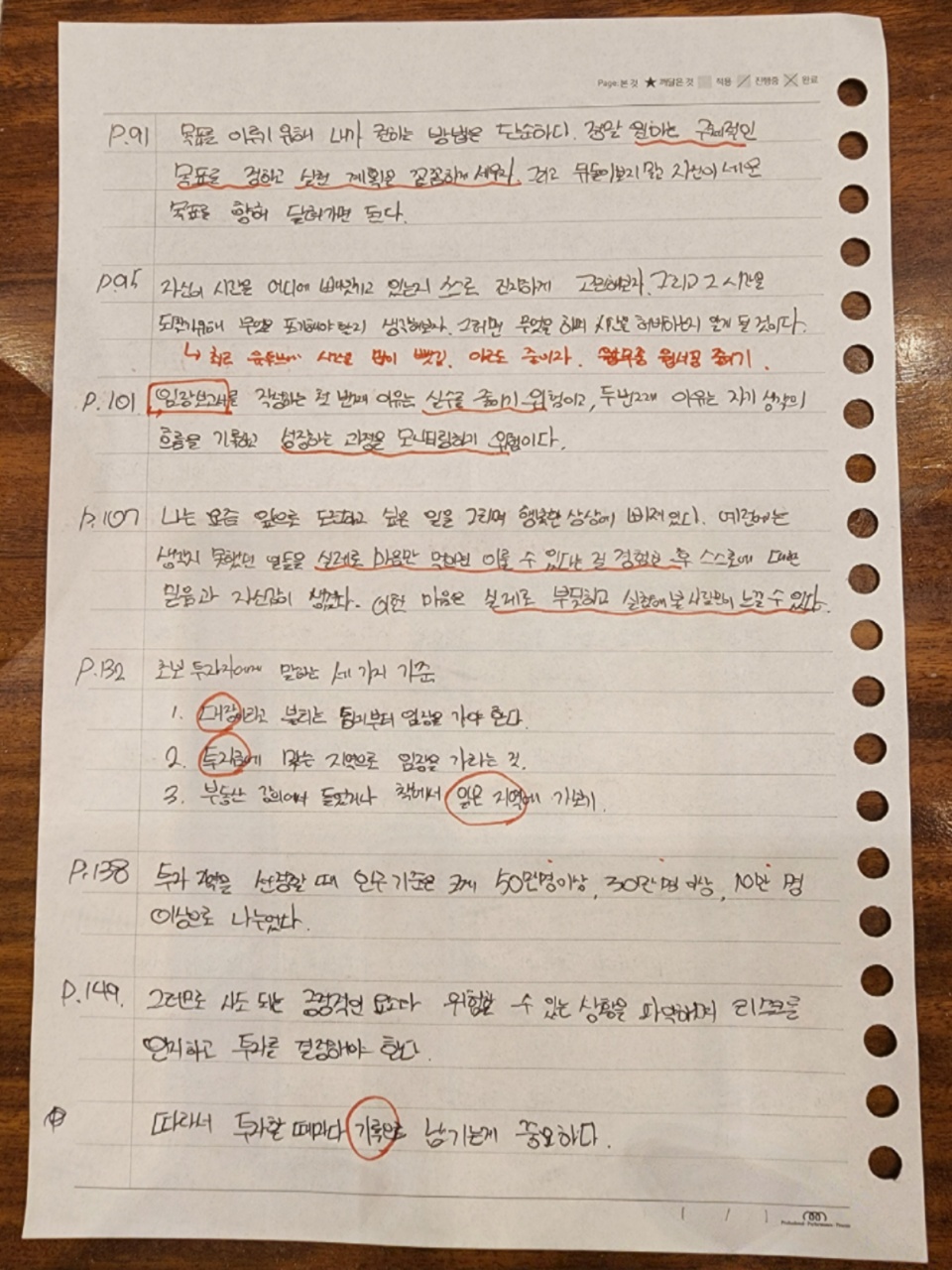 P.208 지금부터 버킷리스트를 하나씩 만들면서 행복한 고민을 해야겠다. 부동산 투자로 이런 꿈을 꾸게 된 것 자체가 즐겁다. 그리고 꿈을 하나씩 실현하는 과정은 정말 행복하다. 직장인이라고 해서 못 할 것은 없다. 일단 준비하고 실행하고 꾸준히 이어나가겠다는 마음만 있으면 된다.