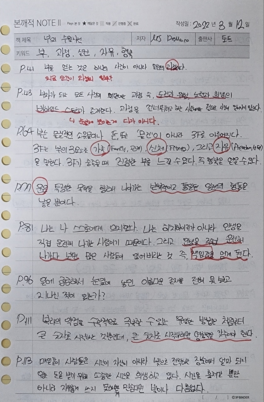 P.64 부는 물질적인 소유물이나 돈, 또는 '물건'이 아니라 3F로 이루어진다. 3F는 부의 3요소로 가족(Family, 관계), 신체(Fitness, 건강), 그리고 자유(Freedom, 선택)을 말한다. 3F가 충족될 때 진정한 부를 느낄 수 있다. 즉 행복을 얻을 수 있다.