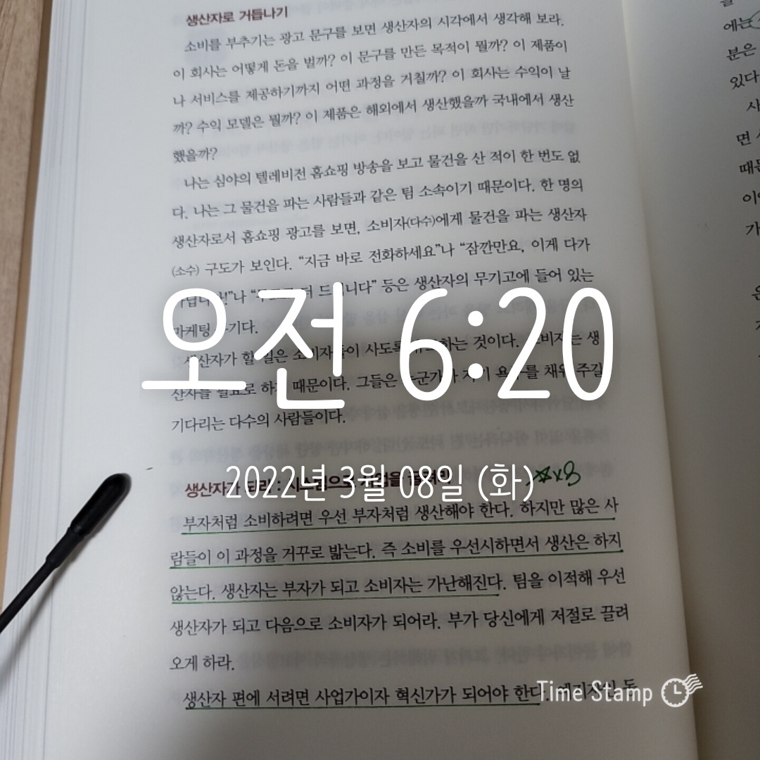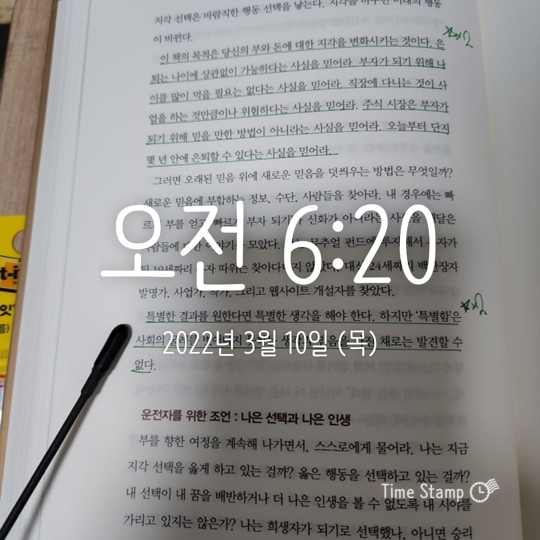 이 책을 읽고 가장 반성하게 된 부분은 '시간이 무한하다'라고 생각했던 점이다. 이런 생각이 내가 하고 싶었던 일들을 계속해서 미뤄왔었고, 돈 생각에 시간을 소중하게 쓰지 못했다는 점이 가장 후회로 남는다. 내일이 마지막이라고 생각한다면 지금까지 해왔던 선택들에 조금은 후회가 남지 않을까 생각한다. 앞으로는 무한한 '돈' 보다는 부족한 '시간'을 중요하게 쓰자!