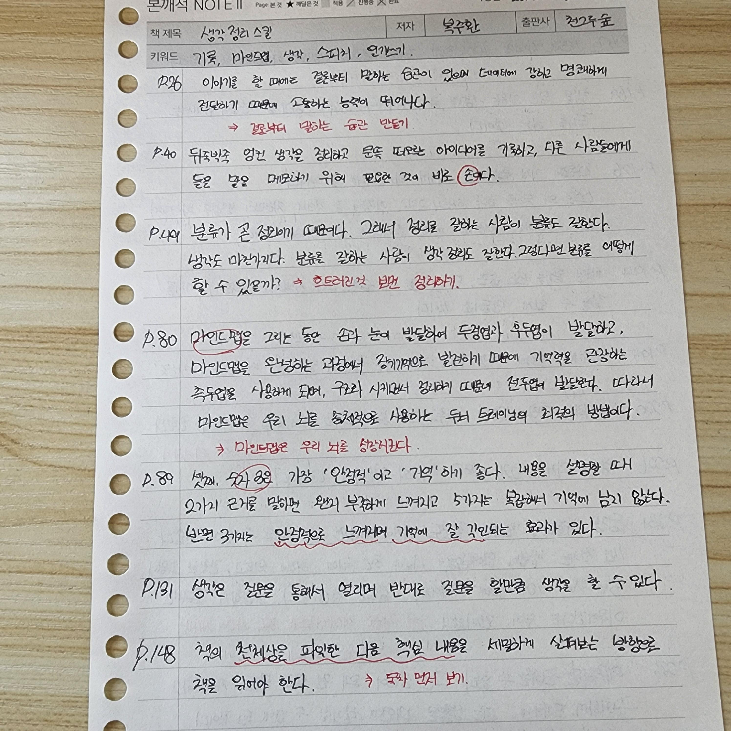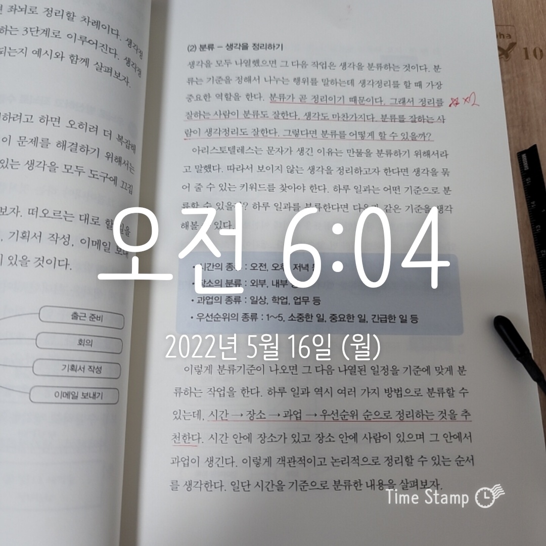 P.49 분류가 곧 정리이기 때문이다. 그래서 정리를 잘하는 사람이 분류도 잘한다. 생각도 마찬가지다. 분류를 잘하는 사람이 생각정리도 잘한다. 그렇다면 분류를 어떻게 할 수 있을까?... 시간 → 장소 → 과업 → 우선순위 순으로 정리하는 것을 추천한다.