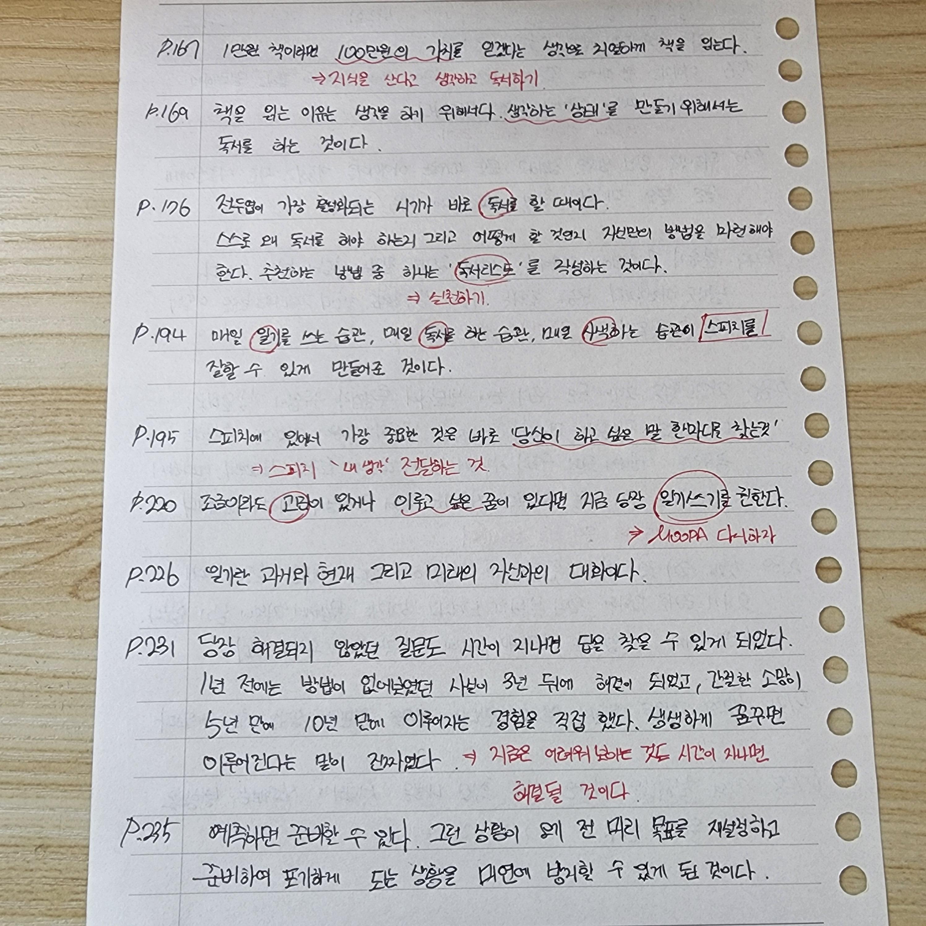 P.194 매일 일기를 쓰는 습관, 매일 독서를 쓰는 습관, 매일 사색을 하는 습관이 스피치를 잘할 수 있게 만들어준 것이다.