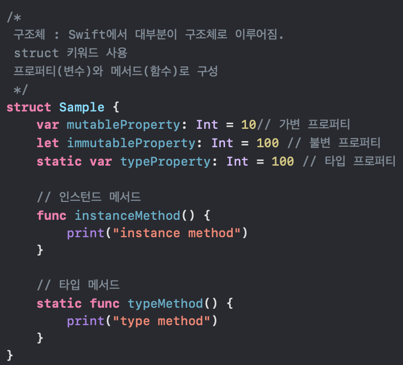 - 구조체 (struct) - 클래스 (class) - 열거형 (enum) - 클래스 vs 구조체 - 클로저 기본 - 클로저 고급 - 프로퍼티와 프로퍼티 감시자(willSet, didSet) - 상속 (ex.Student : Person) - 인스턴스 생성 (init, deinit) - 옵셔널 체이닝과 nil 병합 (ex. noel?.home?.guard?.job ?? "슈퍼맨") - 타입 캐스팅 (인스턴스 타입 확인) - assert/guard (예외상황 처리) - 프로토콜 : 특정 역할 수행하기 위한 요구사항 정의 (매서드, 프로퍼티, 이니셜라이즈) - 익스텐션 : 타입에 새로운 기능 추가 - 오류 처리 - 고차함수 (전달인자로 함수를 받거나, 함수실행 겨로가를 함수로 변환하는 함수. map/filt..